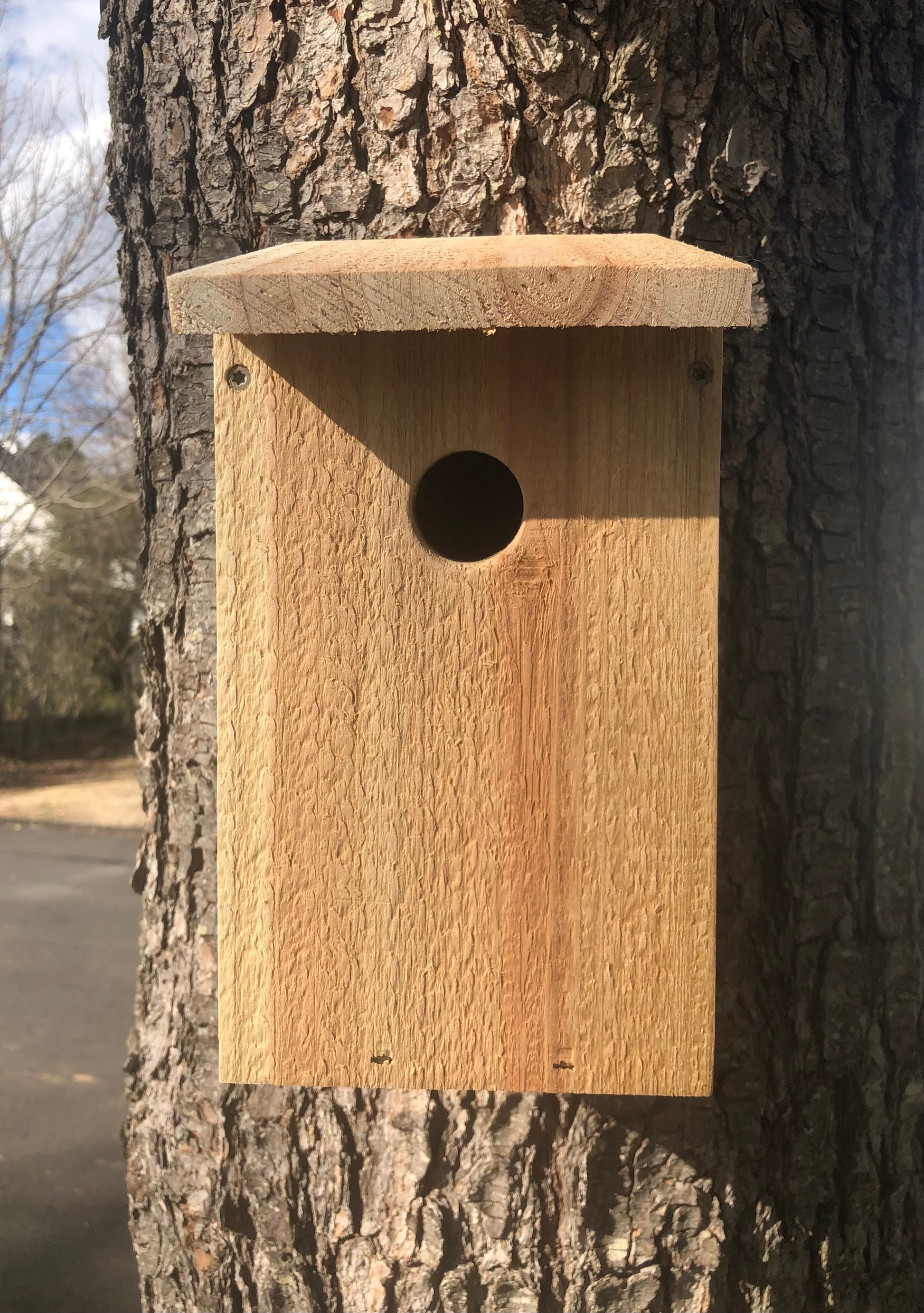 This birdhouse is a great addition to any yard and made of untreated cedar wood. One side is capable of opening up to allow for easy cleaning, and can be secured when closed. The roof is sloped and hangs over the entrance to protect from rain.