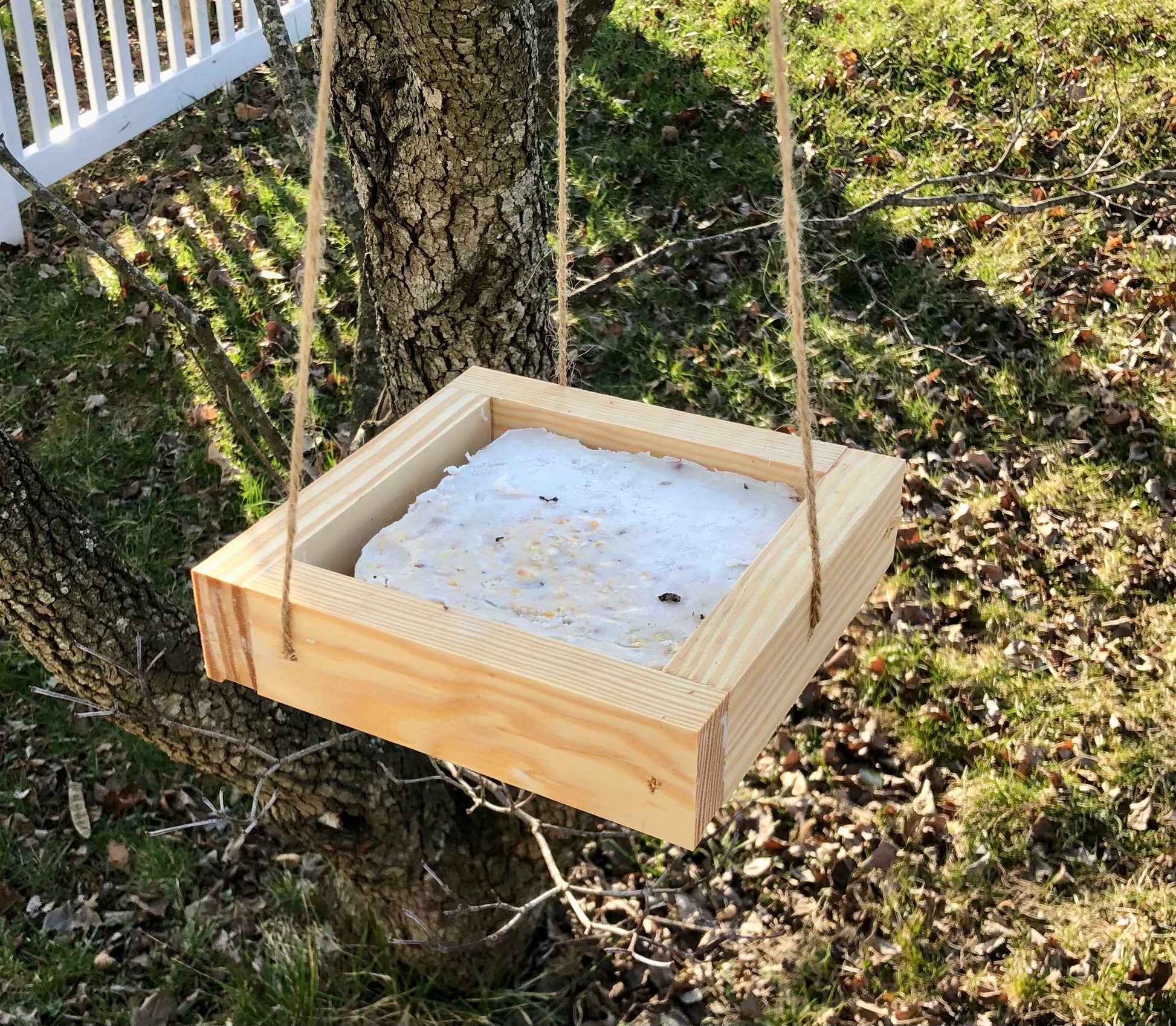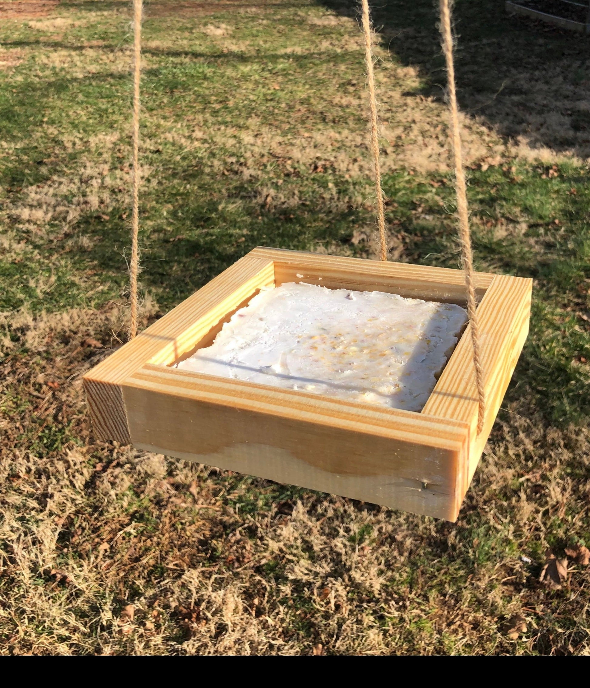 This bird feeder hangs easily from any branch, nail or hook, and is the perfect size for a block of suet. Bird seed can also be used, but with a seed mix very small pieces may fall through the mesh screen (although I have found both squirrels & birds appreciate the ground offerings).